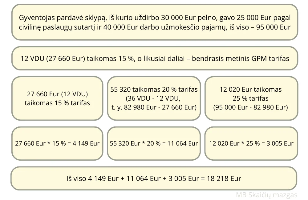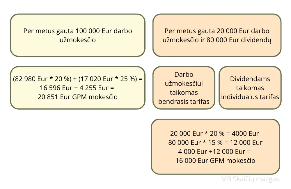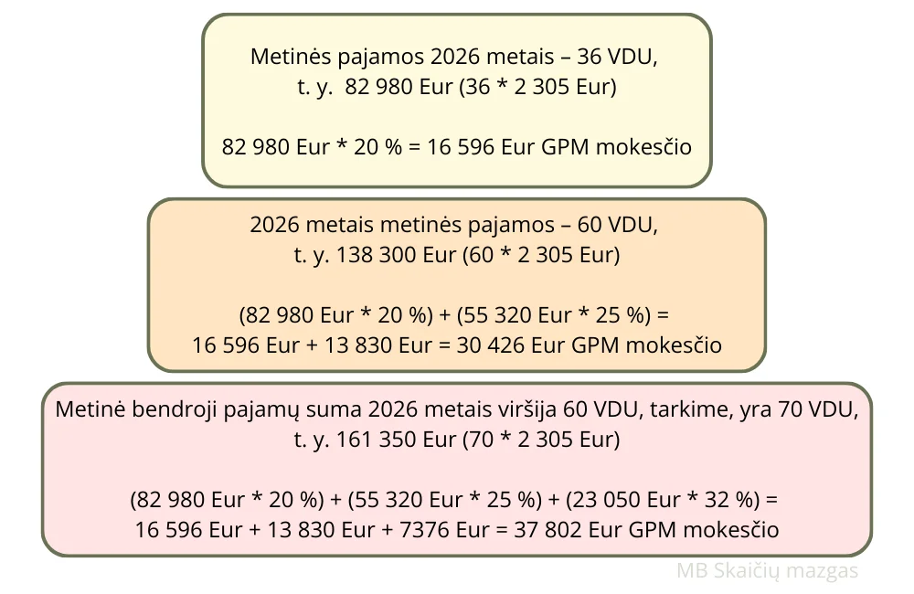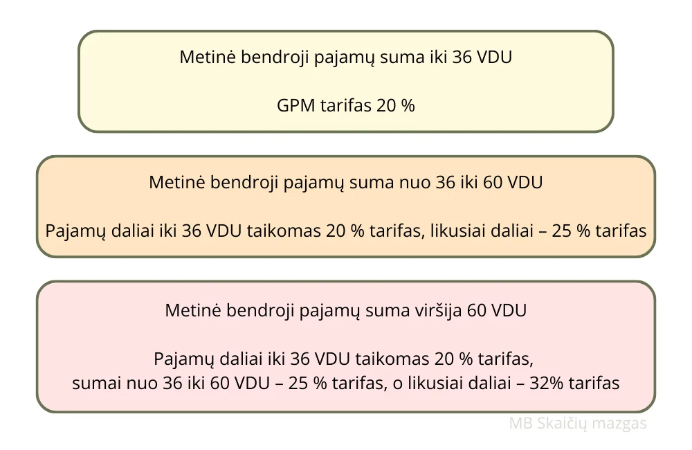 Bendrosioms metinėms pajamoms bus taikomi trys GPM tarifai: 20 %, 25 % ir 32 %. Klaidinga manyti, kad jeigu nustatyta riba bus viršyta nors vienu euru, visos pajamos jau bus apmokestintos didesniu GPM tarifu. Metinėms pajamoms viršijus nustatytus VDU dydžius, galios du ar trys tarifai vienu metu. Tai atrodys taip: