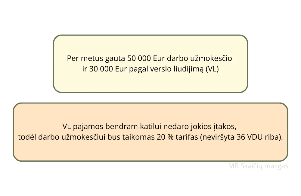 Tokios pajamos bus įskaičiuojamos į bendrą katilą, bet joms galios specialus tarifas. Visų kitų pajamų sumai iki 12 VDU (2026 metais – 27 660 Eur) bus taikomas 15 % GPM tarifas, o likusiai daliai – bendrasis tarifas nuo 20 % iki 32 %.